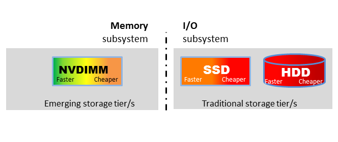 Figure 1 illustrates the growing range of storage devices. Devices are sorted by latency from the fastest on the left to the cheapest on the right. We also recognize that each commodity device has several implementations, some optimized for speed and others for price. For the well-known SSD box those would be the high-performance NVMe devices (orange) and the low cost TLC NAND based SATA drives (red).