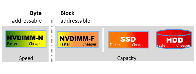 Figure 2 shows that there are two main NVDIMM types. NVDIMM-F is basically a variation of an SSD device that “happens” to reside on the memory interconnect.